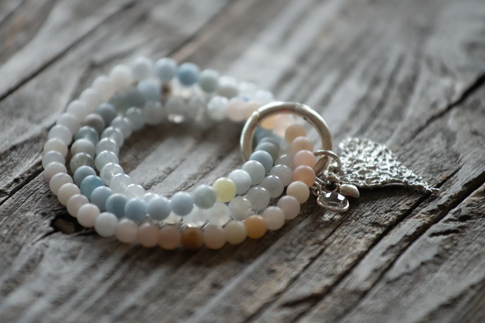3faches Armband mit Aquamarin und Pfirsichqarz matt, 6mm.